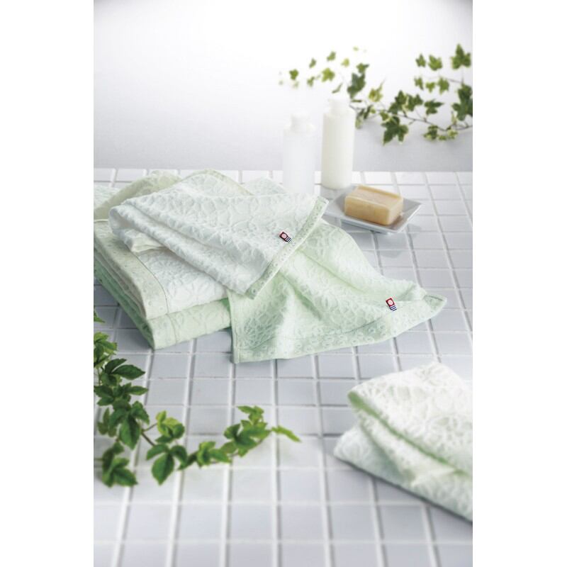 フェミニンなかわいらしさが溢れるやさしい今治タオルに心からの感謝を込めたカスミソウのあしらいを添えて。カスミソウモチーフを繊細に織り上げた心地良い今治タオルが暮らしを奏でるホワイトシルバーと爽やかなミントグリーンのやさしいハーモニー。