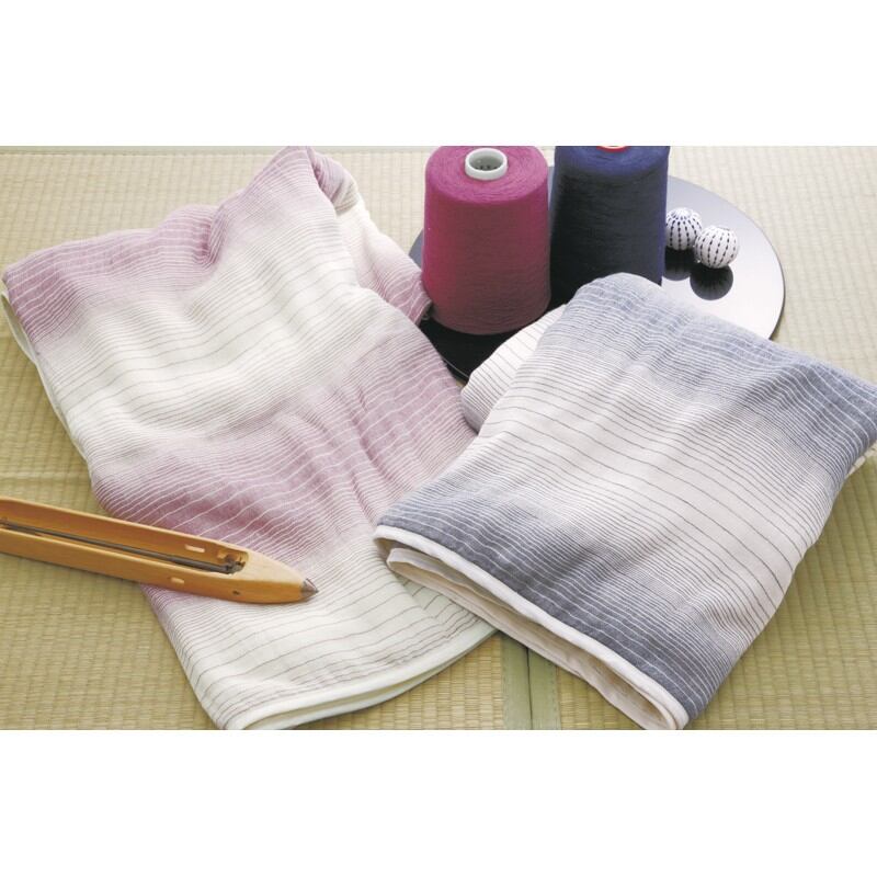 三河木綿の歴史を年輪に見立て、涼しげな柄に仕上げた蒲郡産の三重織ガーゼケットです。洗うほどにふんわり、肌にやさしいガーゼの風合いをお楽しみください。