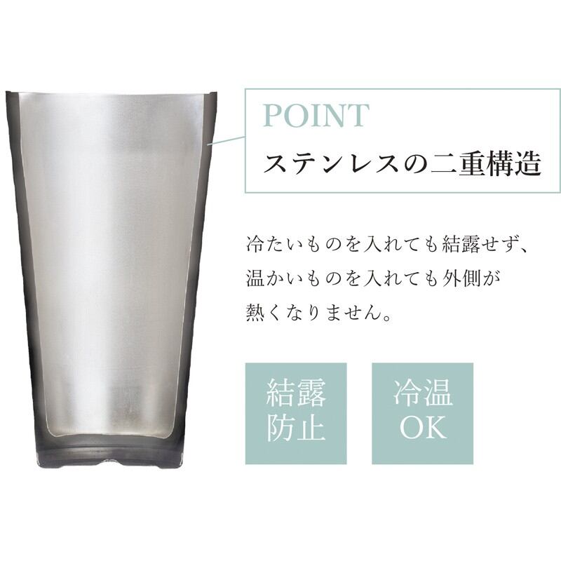 ステンレスの真空断熱二重構造で飲み頃の温度をキープするタンブラー。冷たいものを入れても結露せず、温かいものを入れても本体外側が熱くなりません。