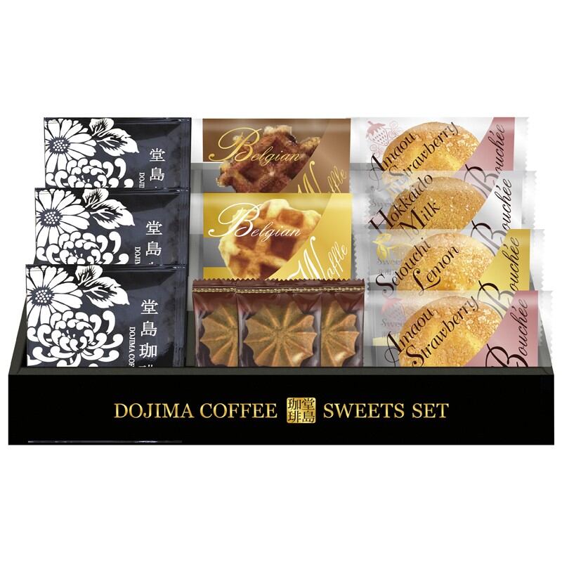商品内容:堂島珈琲ドリップコーヒー8g・コーヒークッキー×各3、あまおう苺ブッセ×2、ブッセ(瀬戸内レモン・北海道ミルク)・ベルギーワッフル(プレーン・ショコラ)×各1
