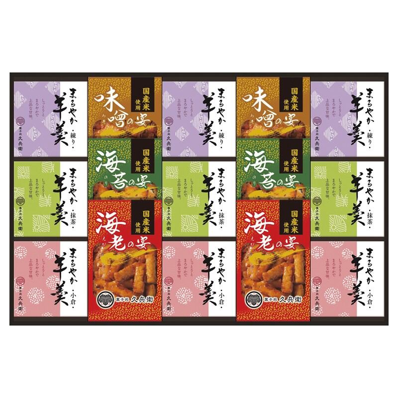 商品内容:あられ(海老・海苔・味噌)12g×各2、羊かん(抹茶・練り・小倉)60g×各3