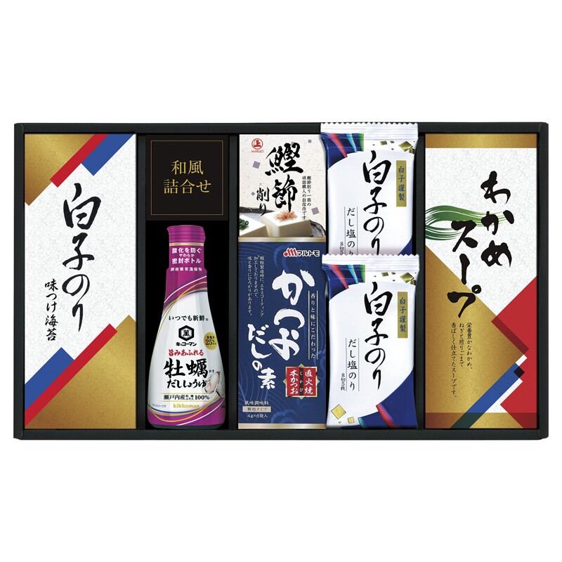 商品内容:白子だし塩のり(8切5枚)×2、白子味のり(3切5枚)・鰹節削り(1.5g×2)・マルトモかつおだしの素(4g×6)・わかめスープ(5.3g×4)・キッコーマン牡蠣だししょうゆ200ml×各1
