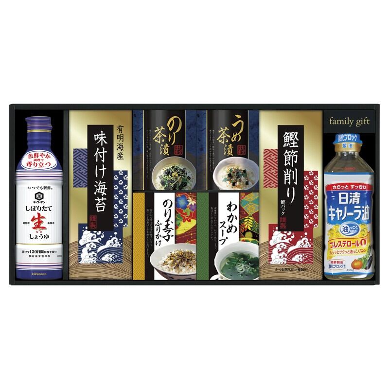 商品内容:有明海産味付け海苔(3切6枚)・のり茶漬け(4.3g×2)・うめ茶漬け(4.3g×2)・のり玉子ふりかけ(4.5g×2)・わかめスープ(5.3g×2)・鰹節削り(2g×4)・日清キャノーラ油400g・キッコーマンしぼりたて生しょうゆ450ml×各1