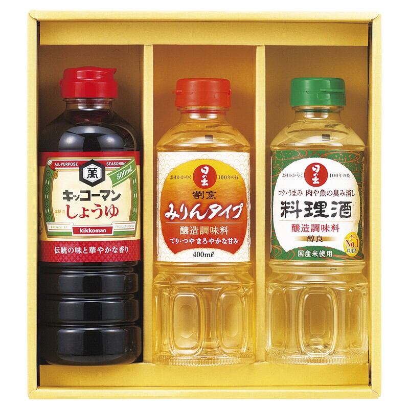 商品内容:キッコーマンこいくちしょうゆ500ml・日の出料理酒400ml・日の出割烹みりんタイプ400ml×各1