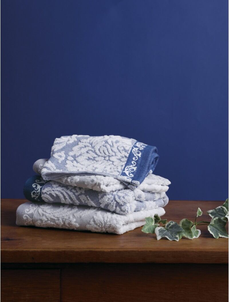 優雅なライフスタイルを演出するタオル ヨーロッパの古い街並みに佇む、歴史ある邸宅の優美な内装や調度品からインスピレーションを受けた、落ち着いたブルーを基調にしたエレガントなデザインは贈り物に最適です。