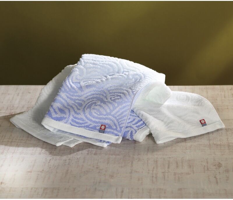 透き通るような青のグラデーションと白のコントラスト、打ち寄せる白波のように織られた波の模様が印象的。綿の柔らかさを生かしつつ、軽くさっぱりとした肌触りに織り上げられています。