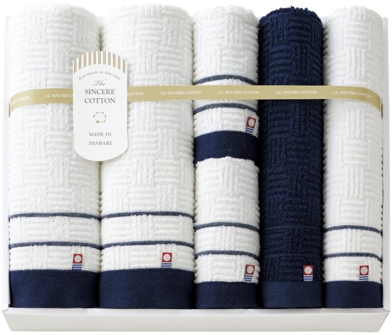 ノーブルな紺色と白色のコントラストが美しい、高級感のあるタオルです。フォーマルでも映えるシックでモダンなデザインが自慢です。