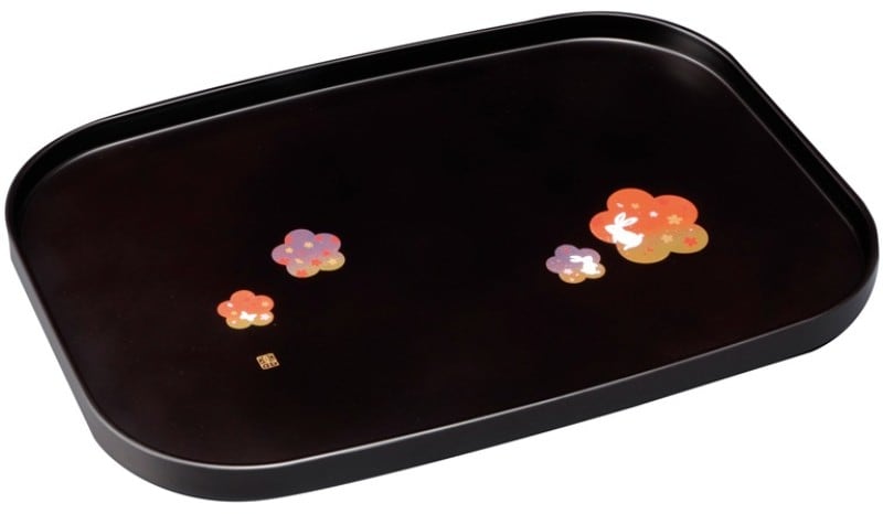 紀州漆器の産地で丁寧に塗装されたお盆に、現代蒔絵の技法で可愛らしいうさぎの柄を施しています。蒔絵独特のグラデーションの煌びやかさがポイントです。