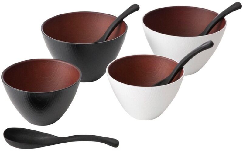 商品内容:ボウル(小):φ10.8×6.8㎝(320ml)・ボウル(大):φ12.8×8㎝(550ml)×各2、スプーン:14.9×4㎝×4