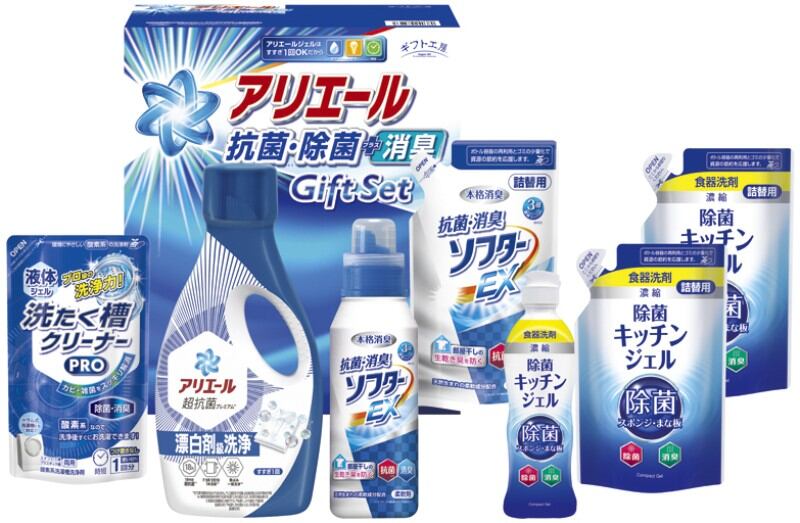 抗菌洗剤アリエールと、少量でたくさん洗える濃縮タイプの食器洗剤除菌ジェル、室内干しのイヤなニオイを防ぎ、ふっくら柔らかく仕上がる抗菌・消臭ソフターなどのギフトです。