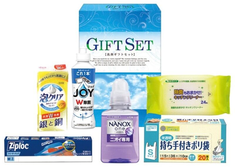 商品内容:ライオンNANOXone380g・P&G除菌ジョイコンパクト170ml・ジップロックフリーザーバッグM3枚・持ち手付きポリ袋S20枚・キッチンクリーナー24枚・泡クリアスポンジ×各1