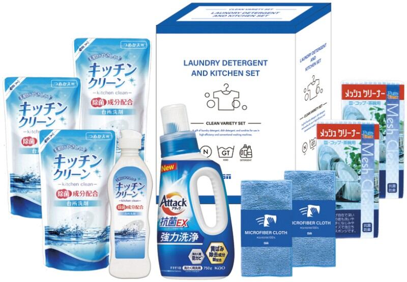 商品内容:花王アタック抗菌EX本体750ml・キッチンクリーン250ml×各1、キッチンクリーン詰替200ml×3、メッシュクリーナー・マイクロファイバークロス:20×20㎝×各2