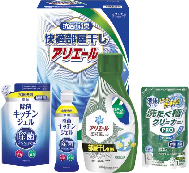 生乾き臭・カビ臭にWで効く部屋干し用のアリエールジェルと本格消臭の抗菌部屋干しソフター、食器洗剤除菌キッチンジェルが入ったクリーンギフトです。