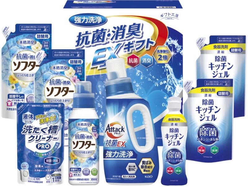 商品内容:花王アタック抗菌EX750g・抗菌消臭ソフター350g・除菌キッチンジェル200ml・液体洗たく槽クリーナーPRO200g×各1、抗菌消臭ソフター(詰替)300g・除菌キッチンジェル(詰替)160ml×各2