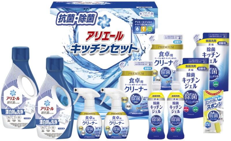 商品内容:P&Gアリエールジェル700g・除菌キッチンジェル200ml・除菌キッチンジェル(詰替)160ml・食卓用クリーナー260ml・食卓用クリーナー(詰替)250ml×各2、コンパクトスポンジ×1