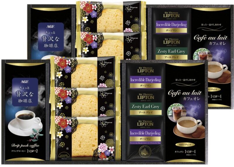 商品内容:AGFちょっと贅沢な珈琲店スペシャルブレンド(7g×2)・サー・トーマス・リプトン アールグレイティーバッグ2.1g・カフェオレ(12g×4)×各2、サー・トーマス・リプトン ダージリンティーバッグ2.2g×4、金澤兼六製菓オリジナルケーキ(プレーン)×6