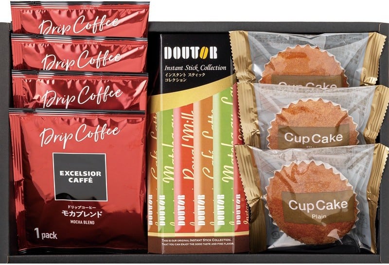 商品内容:エクセルシオールカフェドリップコーヒー(モカブレンド8g)×4、カップケーキ(プレーン)×3、ドトールインスタントスティック(抹茶オレ11g・カフェラテ14g・ロイヤルミルクティー15g×各2本入)×1