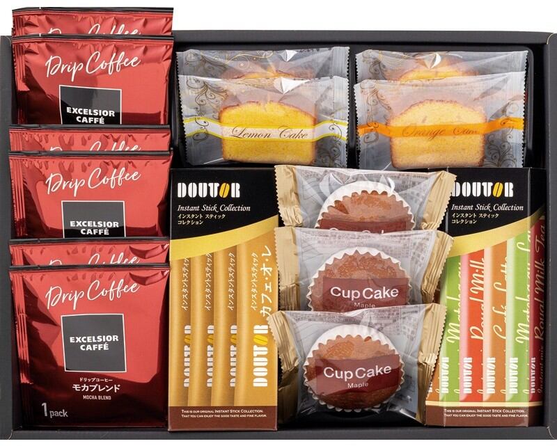 商品内容:エクセルシオールカフェドリップコーヒー(モカブレンド8g)×6、カップケーキ(メープル)×3、カットケーキ(レモン・オレンジ)×各2、ドトールインスタントスティックカフェオレ(9.5g×4本入)・ドトールインスタントスティック(抹茶オレ11g・カフェラテ14g・ロイヤルミルクティー15g×各2本入)×各1
