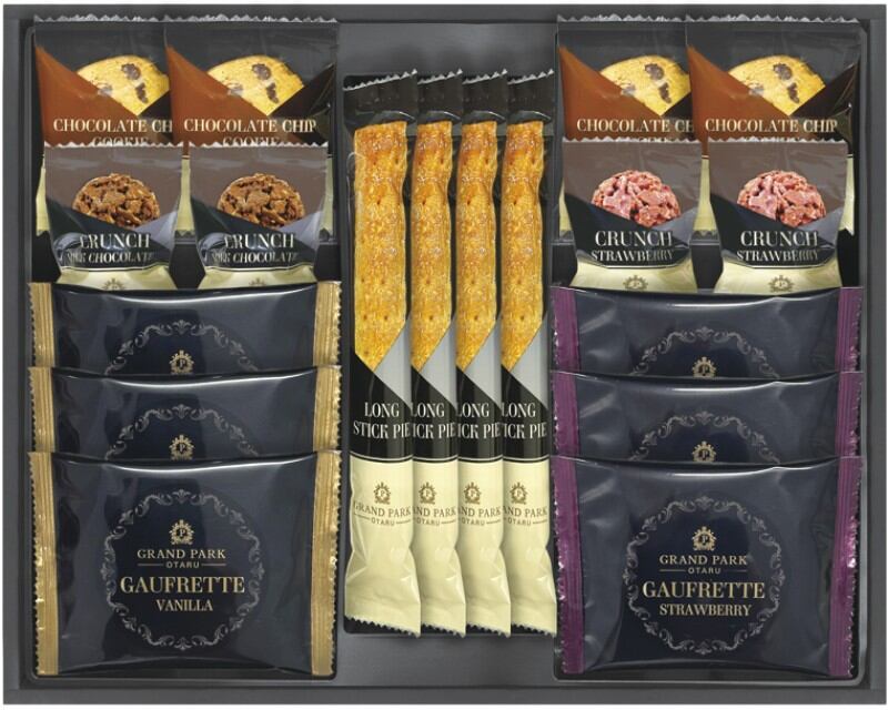 商品内容:ロングスティックパイ・チョコチップクッキー×各4、ゴーフレット(バニラ・ストロベリー)×各3、チョコクランチ(ミルク・ストロベリー)×各2