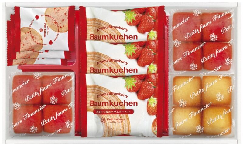 商品内容:あまおう苺バウムクーヘン・焼きほろろクッキー(イチゴ)×各3、プチフィナンシェ4個入(あまおう苺)×2、プチフィナンシェ4個入(プレーン)×1