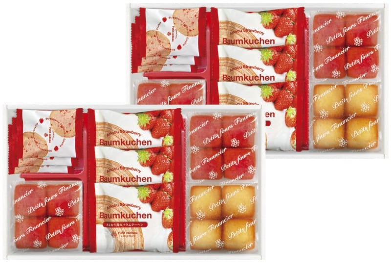 商品内容:あまおう苺バウムクーヘン・焼きほろろクッキー(イチゴ)×各6、プチフィナンシェ4個入(あまおう苺)×4、プチフィナンシェ4個入(プレーン)×2