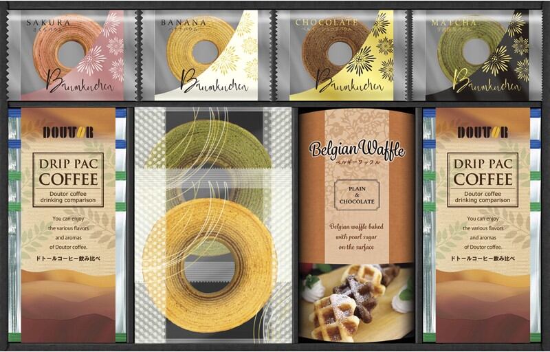 商品内容:ミルクバウムクーヘン・宇治抹茶バウムクーヘン・ミニバウムクーヘン(バナナ・桜・ベルギーショコラ・宇治抹茶)・ベルギーワッフル(ショコラ)×各1、ドトールドリップコーヒー(深煎りブレンド7g・キリマンジャロブレンド7g)×各4、ベルギーワッフル(プレーン)×2
