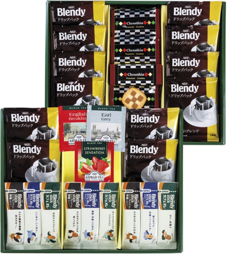 商品内容:チェスティアクッキー・AGFブレンディコーヒードリップ式7g×各12、紅茶(アールグレイ・イングリッシュブレックファースト・ストロベリー)2g×各1、AGFブレンディスティック(エスプレッソオレ5.8g・カフェオレハーフ5.4g・カフェオレ8.2g)×各3