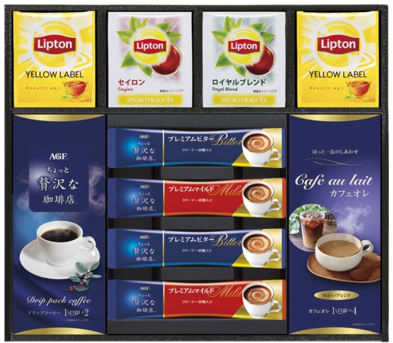 商品内容:AGF ちょっと贅沢な珈琲店スペシャルブレンド(7g×2)・カフェオレ(12g×4)×各1、AGF ちょっと贅沢な珈琲店(プレミアムマイルド7g・プレミアムビター7g)・リプトン(ロイヤルブレンドティーバッグ2.2g・セイロンティーバッグ2.2g)×各2、リプトン イエローラベル2g×4
