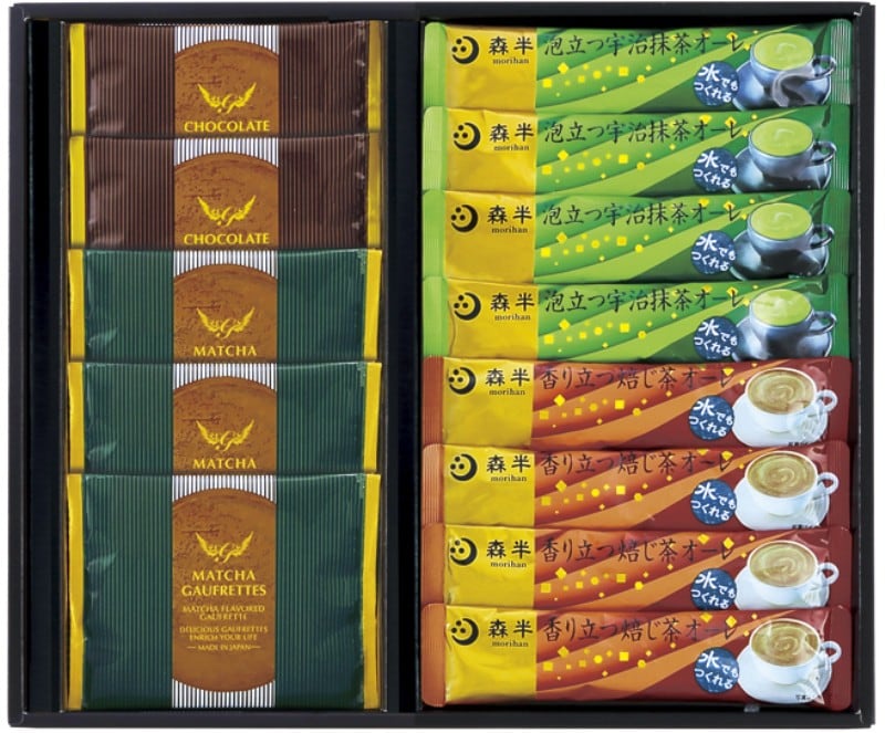 商品内容:ゴーフレット(チョコクリーム)×2、ゴーフレット(抹茶クリーム)×3、宇治抹茶オーレ10g・焙じ茶オーレ10g×各4