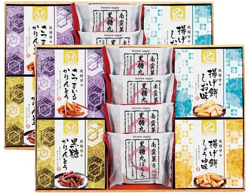 銘菓丸ぼうろに粗く砕いた黒砂糖を練りこんだ黒糖丸ぼうろと、国産玄米から作られた米油100%で揚げたかりんとう、国産のもち米を使用し米油とごま油をブレンドした油で揚げサクッとした食感の揚げ餅などをセットした和菓子詰合せです。