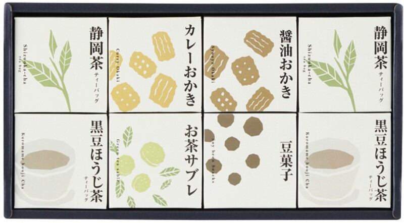 商品内容:ティーバッグ(静岡深蒸茶・黒豆ほうじ茶)(2.5g×7P)×各2、お茶サブレ(3本)・たまり醤油おかき24g・カレーおかき24g・豆菓子(黒ごま味)45g×各1