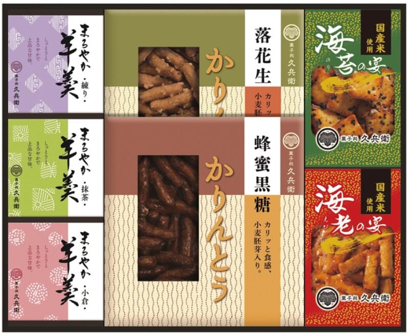 商品内容:かりんとう(蜂蜜黒糖・落花生)40g・あられ(海老・海苔)12g・羊かん(抹茶・練り・小倉)60g×各1