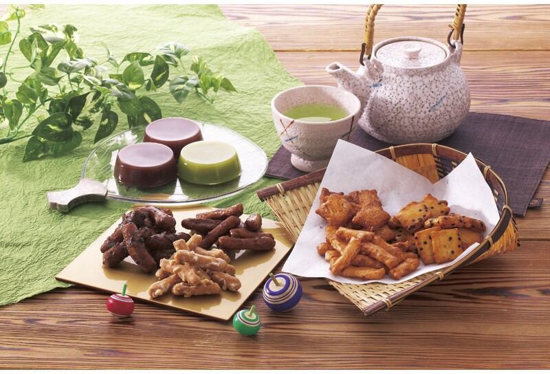 昔ながらの素朴な味のかりんとう、夏でも冬でも楽しめるまろやか羊かん、国産米だけで作ったあられなどを詰合せました。