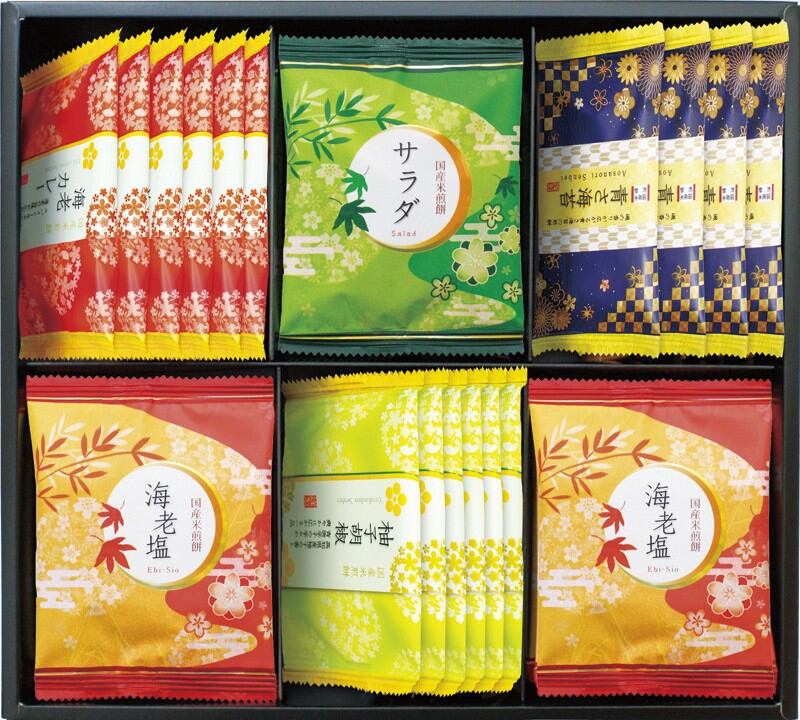 商品内容:海老塩煎餅・柚子胡椒煎餅・海老カレー煎餅×各6、青さ海苔煎餅×4、サラダ煎餅×3