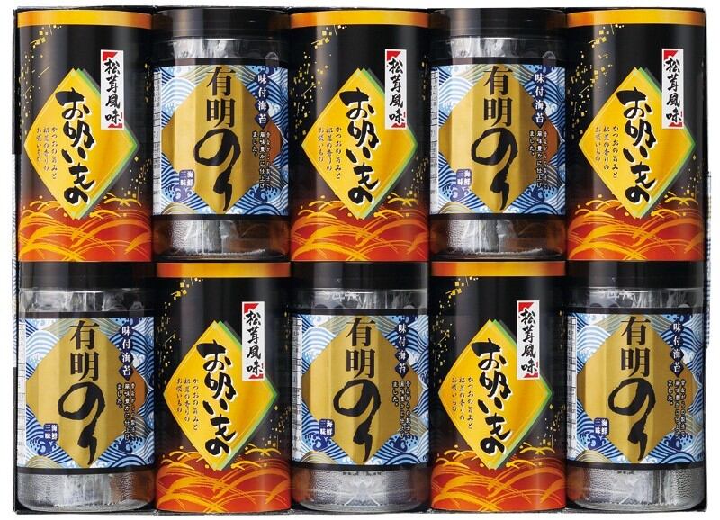 商品内容:有明海苔全型2.5枚(8切4枚×5)・永谷園松茸風味お吸い物(2.3g×4)×各5