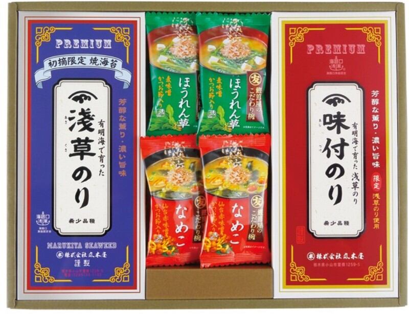 商品内容:浅草焼のり(半切5枚)・浅草味付けのり(8切8枚×3)×各1、マルトモフリーズドライ味噌汁ほうれん草7.5g・マルトモフリーズドライなめこ5.9g×各2