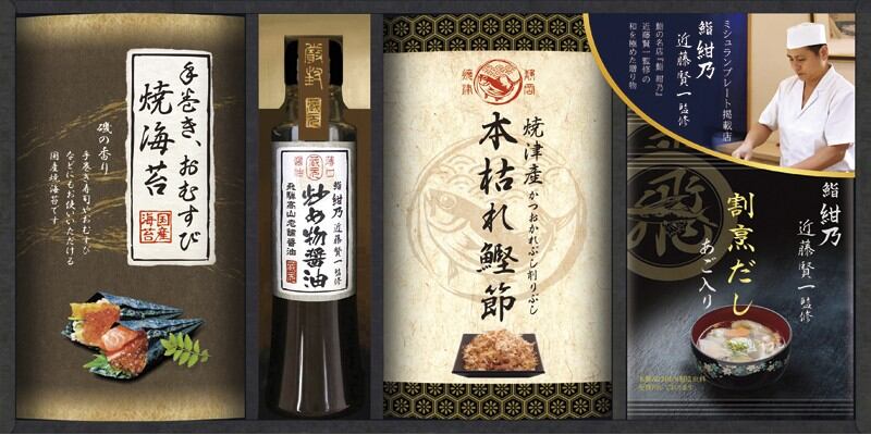 商品内容:鮨 紺乃 近藤賢一監修 あご入り割烹だしパック8g×4、鮨 紺乃 近藤賢一監修 飛騨高山炒め物醤油200ml・焼津産 本枯れ鰹節15g・手巻き・おむすび用 焼海苔(半切5枚)×各1