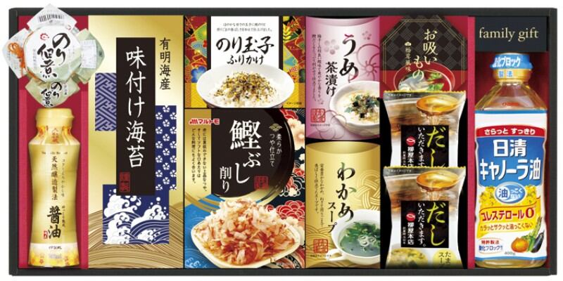 商品内容:日清キャノーラ油400g・島の香のり佃煮80g・有明海産味付け海苔(3切4枚)・のり玉子ふりかけ(4.5g×2)・鰹ぶし削り(2g×4)・うめ茶漬け(4.3g×2)・わかめスープ(5.3g×2)・永谷園お吸いもの松茸風味(2.3g×2)・伊賀越天然醸造しょうゆ200ml×各1、玉子スープ5.4g×2