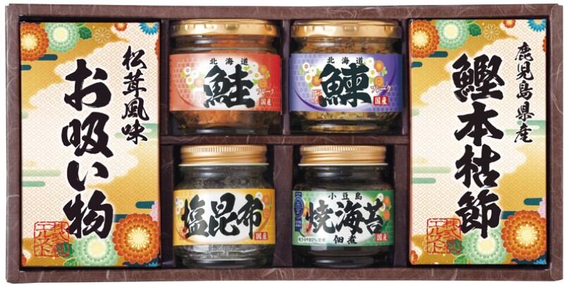 商品内容:焼きのり入佃煮85g・鰹本枯節(2.5g×3)・永谷園お吸い物松茸風味(2.3g×4)・塩昆布18g・鮭フレーク40g・にしんフレーク50g×各1
