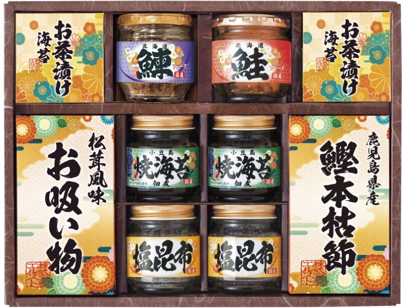 商品内容:焼きのり入佃煮85g・永谷園お茶づけ海苔(4.7g×2)・塩昆布18g×各2、鰹本枯節(2.5g×3)・永谷園お吸い物松茸風味(2.3g×4)・鮭フレーク40g・にしんフレーク50g×各1