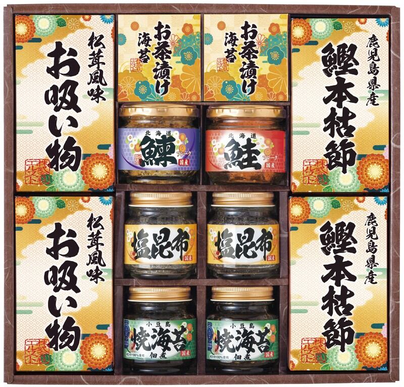 商品内容:焼きのり入佃煮85g・鰹本枯節(2.5g×3)・永谷園お茶づけ海苔(4.7g×2)・永谷園お吸い物松茸風味(2.3g×4)・塩昆布18g×各2、鮭フレーク40g・にしんフレーク50g×各1