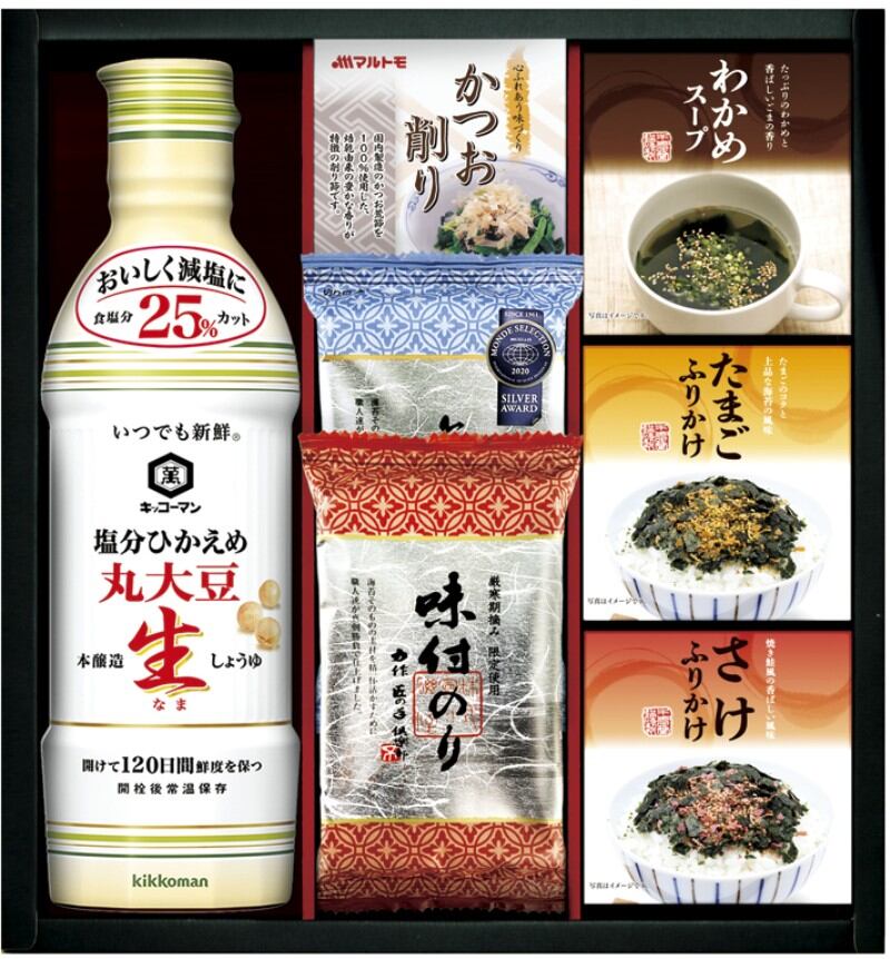 商品内容:キッコーマン塩分ひかえめ丸大豆生しょうゆ450ml・わかめスープ(3.8g×3)・丸美屋たまごふりかけ(2.5g×3)・丸美屋さけふりかけ(2.5g×3)・味付のり(8切6枚)・有明海産塩のり(8切6枚)・マルトモかつおパック(0.7g×3)×各1