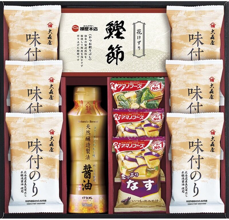 商品内容:アマノフーズいつものおみそ汁なす×2、大森屋味付のり(8切5枚)×6、天然醸造醤油200ml・アマノフーズいつものおみそ汁ほうれん草・柳屋本店かつおパック(3g×3)×各1