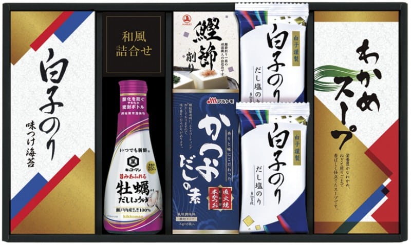 商品内容:白子だし塩のり(8切5枚)×2、白子味のり(3切5枚)・鰹節削り(1.5g×2)・マルトモかつおだしの素(4g×6)・わかめスープ(5.3g×4)・キッコーマン牡蠣だししょうゆ200ml×各1