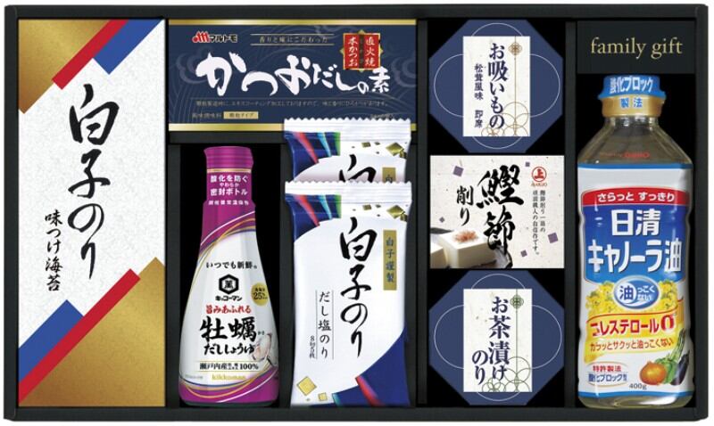 商品内容:白子だし塩のり(8切5枚)×2、白子味のり(3切5枚)・マルトモかつおだしの素(4g×6)・永谷園お吸いもの松茸風味(2.3g×2)・永谷園お茶漬け海苔(4.7g×2)・鰹節削り(1.5g×2)・キッコーマン牡蠣だししょうゆ200ml・日清キャノーラ油400g×各1
