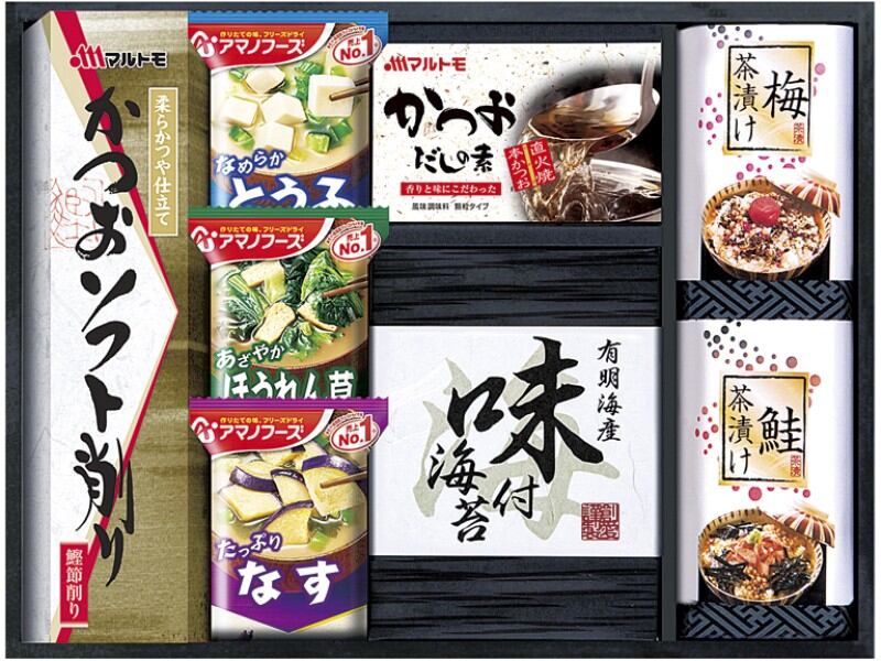 商品内容:アマノおみそ汁(とうふ10g・ほうれん草7g・なす9.5g)・マルトモかつおソフト削り(2g×3)・マルトモかつおだしの素(4g×4)・有明海産味付海苔(8切6枚×2)・梅茶漬け(4.3g×2)・鮭茶漬け(4.7g×2)×各1