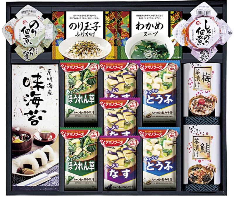 商品内容:アマノなすおみそ汁9.5g×3、アマノみそ汁(ほうれん草7g・とうふ10g)×各2、島の香(のり佃煮80g・しそのり佃煮80g)・のり玉子ふりかけ(4.5g×2)・わかめスープ(5.3g×2)・有明海産味海苔(3切4枚)・梅茶漬け(4.3g×2)・鮭茶漬け(4.7g×2)×各1