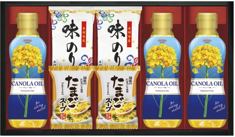 商品内容:キャノーラ油300g×3、有明海産味付のり(8切5枚)・たまごスープ6.4g×各2