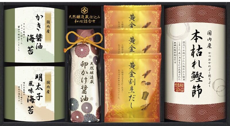 商品内容:牡蠣醤油海苔(8切6枚)・明太子風味海苔(8切6枚)・天然醸造蔵仕込み卵かけ醤油200ml×各1、本枯れ鰹節2g・黄金割烹だしパック8g×各3