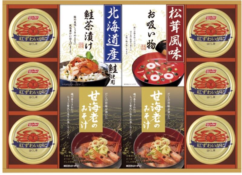 商品内容:甘海老みそ汁(7.5g×3)×2、紅ずわいがにほぐし身55g×6、北海道産鮭茶漬け(4g×3)・永谷園松茸風味お吸い物(2.3g×4)×各1